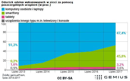 Jak wynika z danych Gemiusa, z roku na rok systematycznie maleje wykorzystywanie komputerów osobistych i laptopów do działań w sieci na rzecz wykorzystywania do tych celów urządzeń mobilnych.